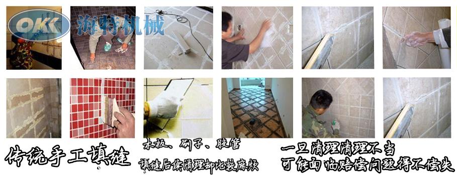 而 在這些縫隙中填入粘結劑成為填縫,傳統填縫方式則是采用人工用木條、鐵板甚至用手,小量的將粘結劑慢慢填補縫隙,或者大面積抹涂后再針對縫隙大小,用鐵線 對準縫隙慢慢壓平粘結劑,等待物料干結后再清洗磚面,遇到光滑面磚可以清洗干凈,如磚面是亞光或者不平整文化磚,則無法清洗,造成施工賠償等糾紛。